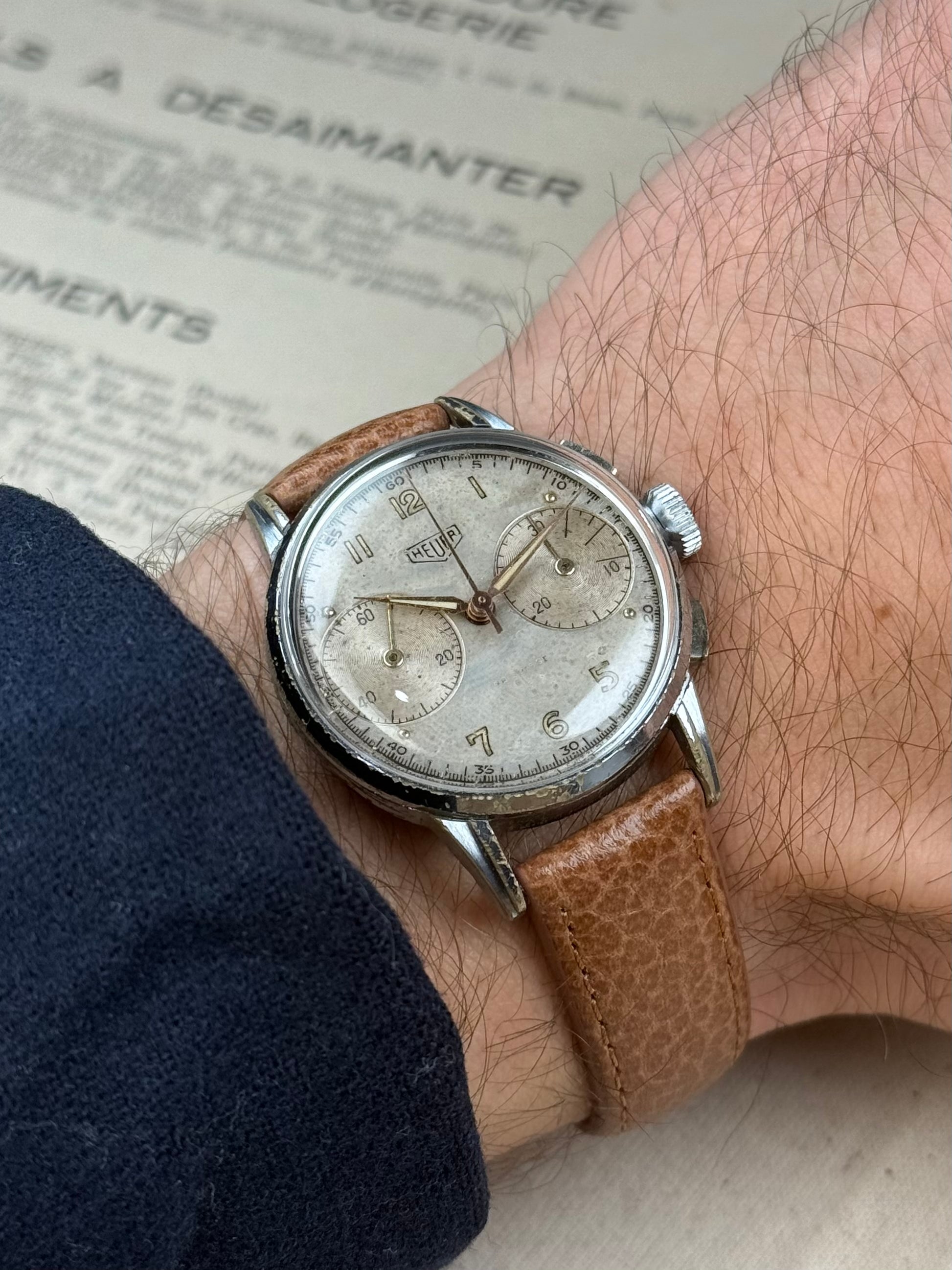 Dotée d’un boîtier chromé de 34 mm, cette Heuer adopte des lignes épurées et intemporelles. Les cornes sont bien travaillées, fines, longues et légèrement courbées, typiques des productions de la période d'après-guerre. Le cadran argenté présente deux compteurs bien équilibrés “Big eyes” (petite seconde et totalisateur 45 minutes).