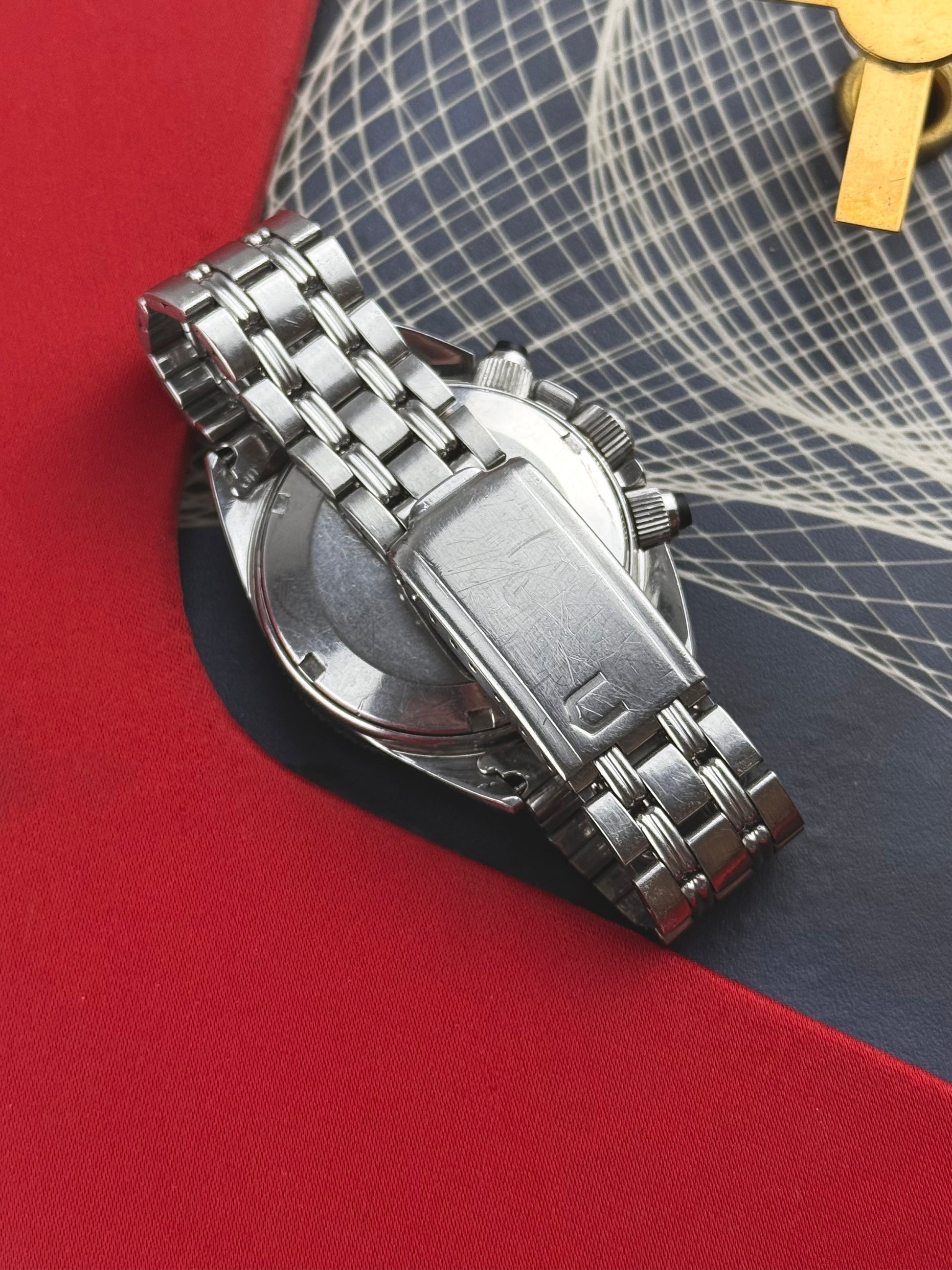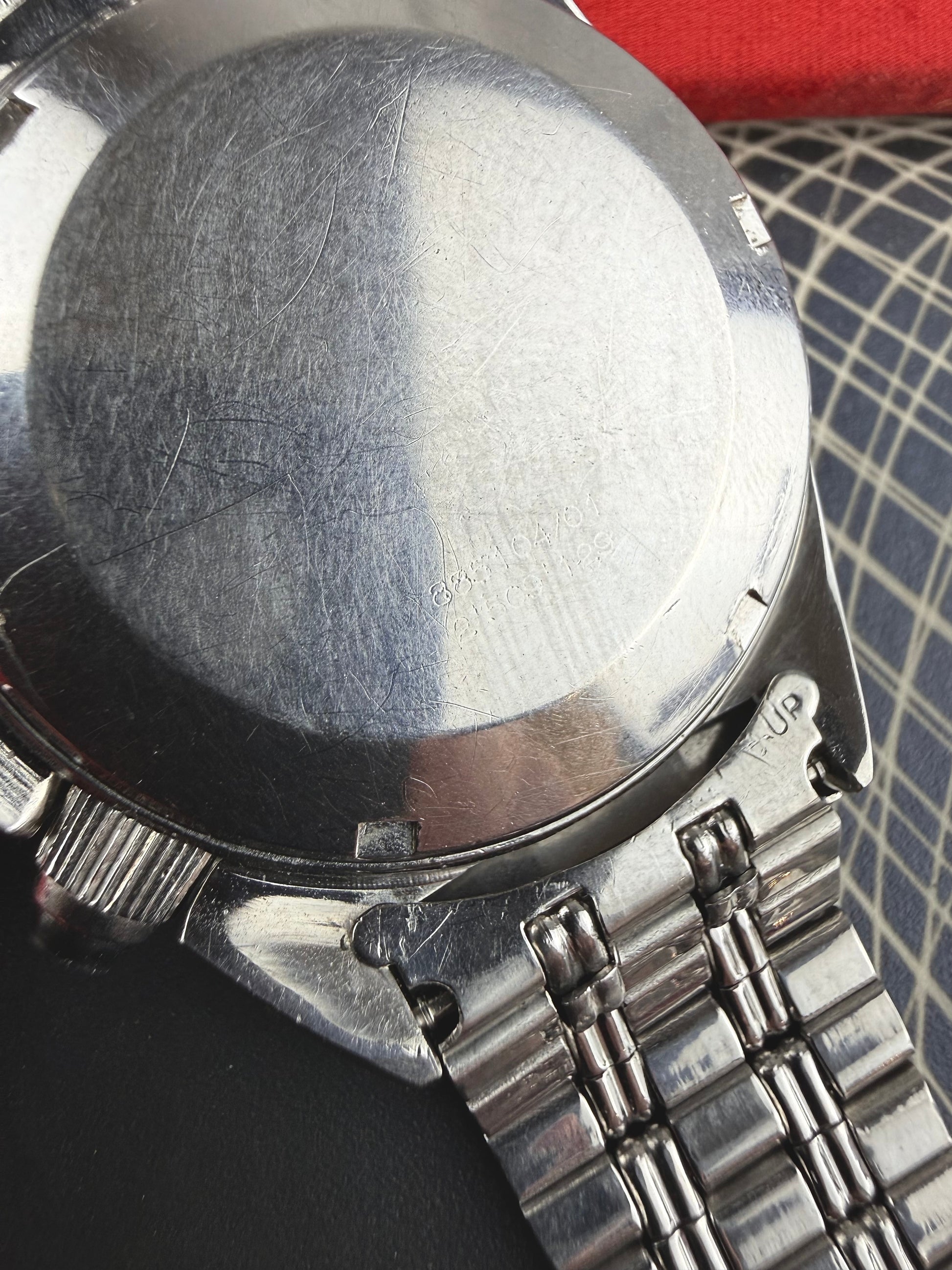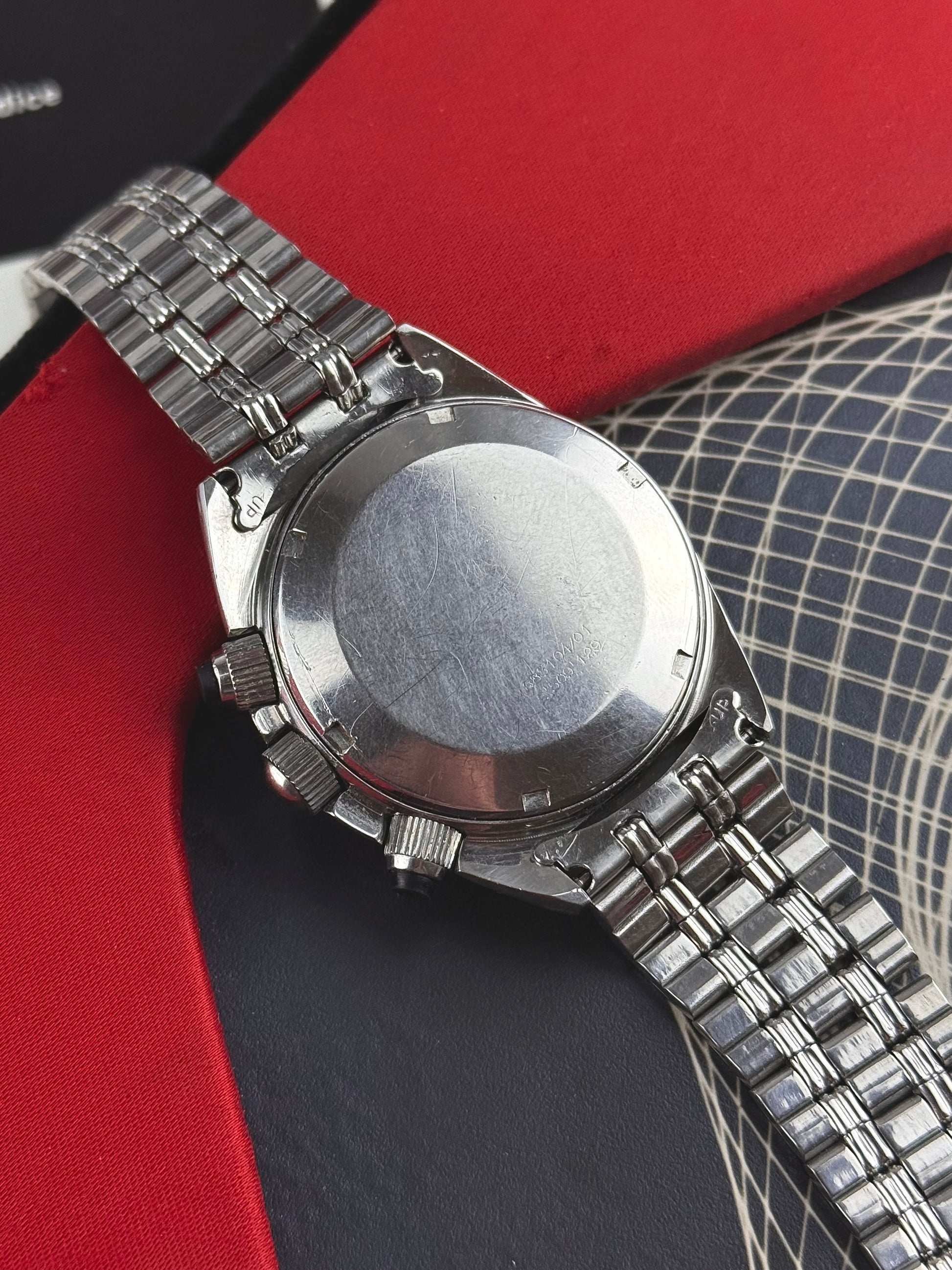 Conçue comme un chronographe étanche, la montre est équipée de poussoirs protégés par membranes et d’une couronne renforcée, lui permettant de résister à des conditions exigeantes. Sa lunette tournante ajoute une fonction de mesure du temps supplémentaire, typique des montres de plongée de l’époque, ce qui en fait un instrument polyvalent à la croisée du chronographe et de la tool watch.